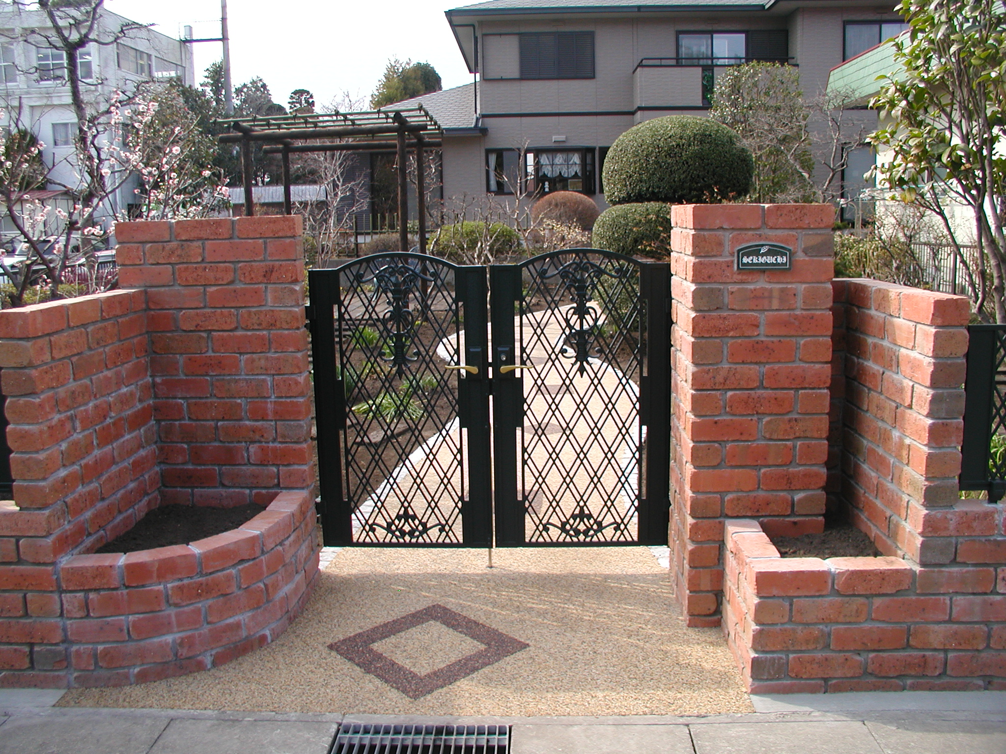 レンガを使用の外構 両脇にフラワーボックスをあしらい門周りを引き立たせます 又 奥に続くナチュランドのアプローチとも良くマッチングしております