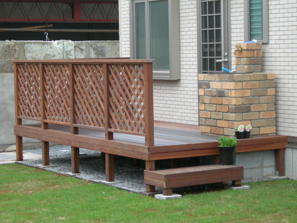 ウッドデッキとガーデンシンク 今人気のガーデンシンクをレンガで積み上げてお洒落に演出しています ペットを洗ったりガーデングリルのカウンターに使用したり・・・・使い方も色々