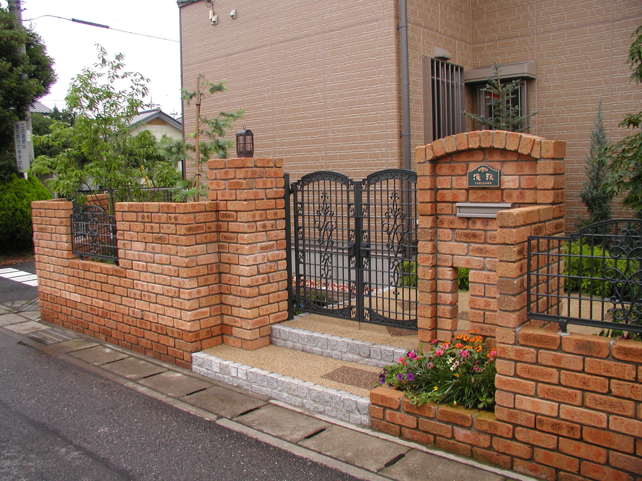 赤レンガによる格調高い外構 建物との融合性 シックにまとまって落ち着いた 雰囲気を醸しだしております