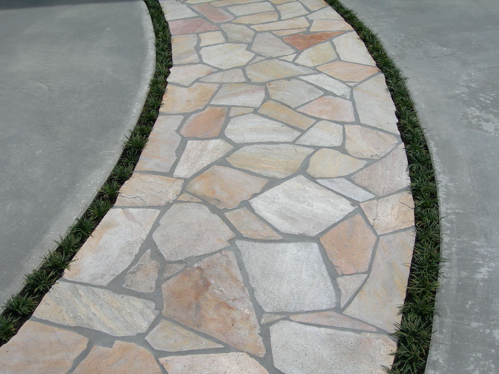 張り石によるアプローチ 両脇はタマリュウをあしらう事により水捌けをよくします。