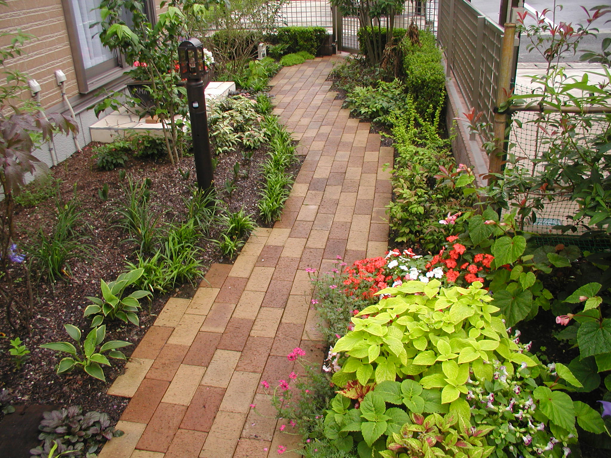 インターロッキングによるアプローチ 変化をもたせた小路の両脇はお好きなお花でガーデ ニングを楽しんでみては如何でしょうか