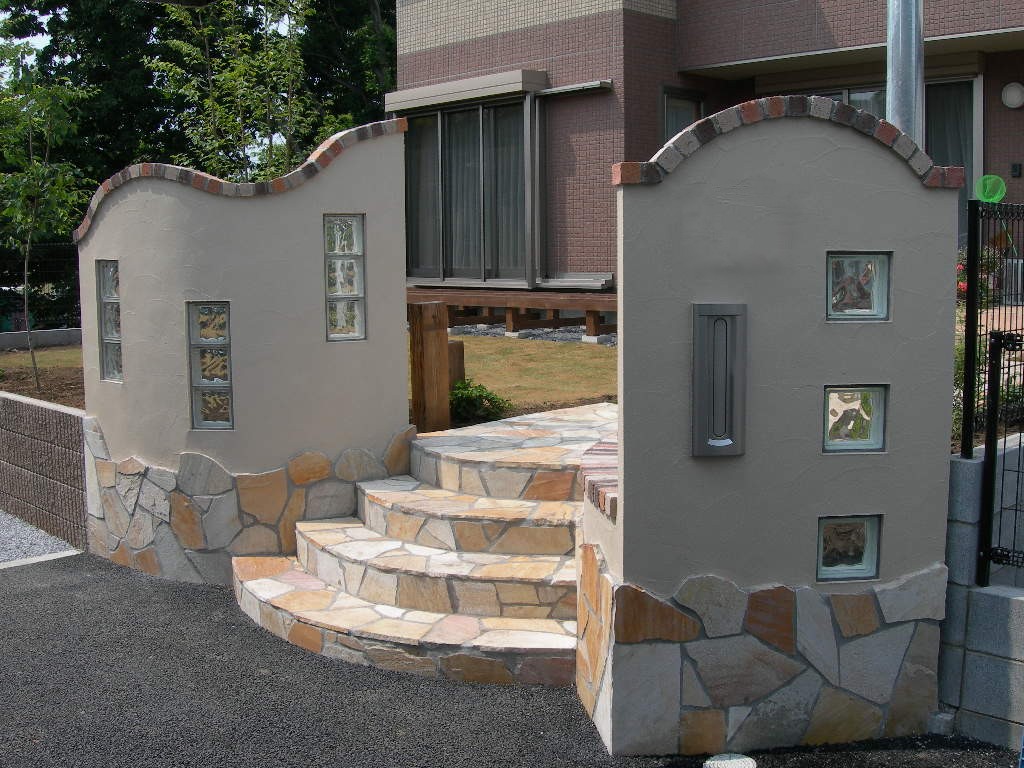 ガラスブロックを使用した張り石によるウォールとのコーディネイト 独自な雰囲気を感じさせます