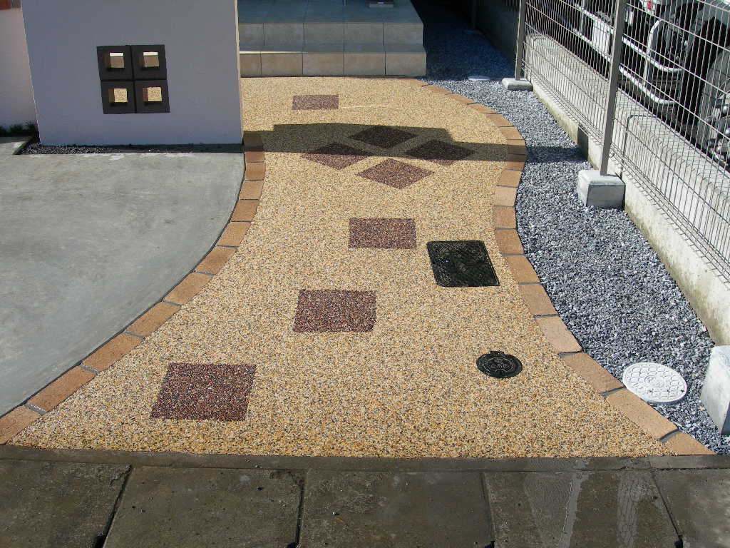 自然石透水性樹脂舗装 ナチュランド によるアプローチ デザイン性 景観性 に富み狭小地にも対応施工出来ます